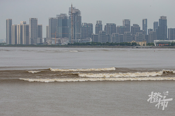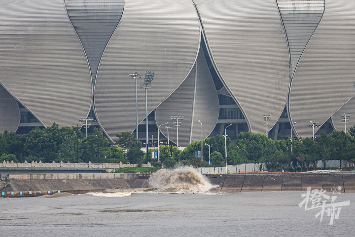 潮水慢慢靠近钱江新城,冲击堤坝溅起的浪花不太大。