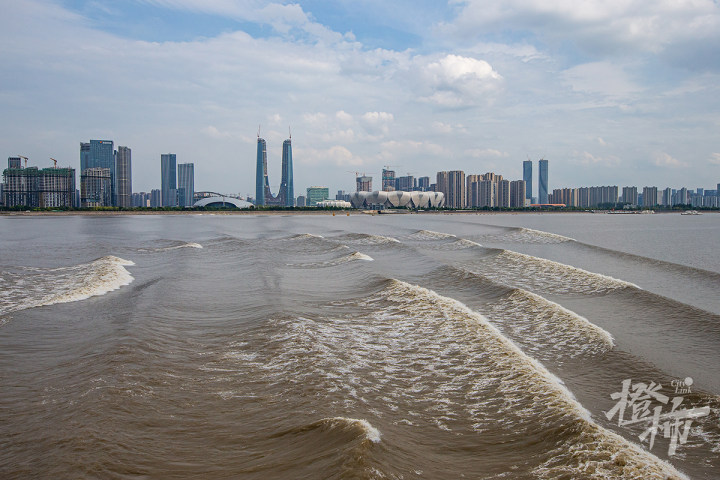 农历七月十八的钱塘江大潮通过钱江新城和奥体中心附近。