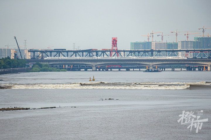 “来了,来了!”15:40,眼尖的市民大喊了一声,只见一道白线从远处的彭埠大桥(钱江二桥)下奔涌而来。高铁列车从桥上驶过,与潮水前后呼应,构成两条白线。