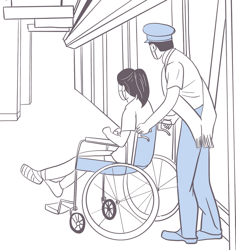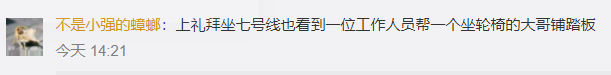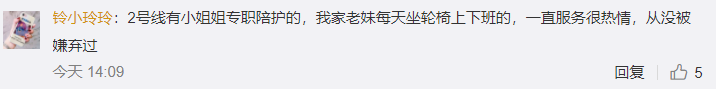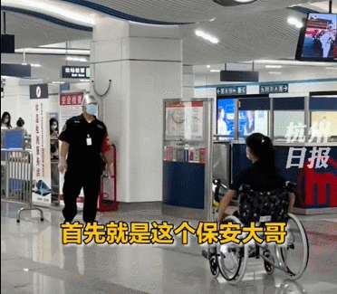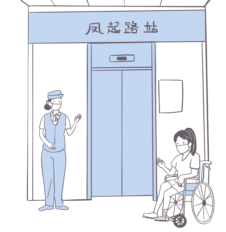 征得同意后,大哥顺手接过她的轮椅推行起来,并询问她待会乘坐的详细线路,“不用担心,每一站都会有工作人员护送你,一直到目的地。”大哥又转头用对讲机和其他工作人员进行了沟通,“我这边有一位女士等会需要一块轮椅踏板,麻烦准备一下,现在我送她下来。”