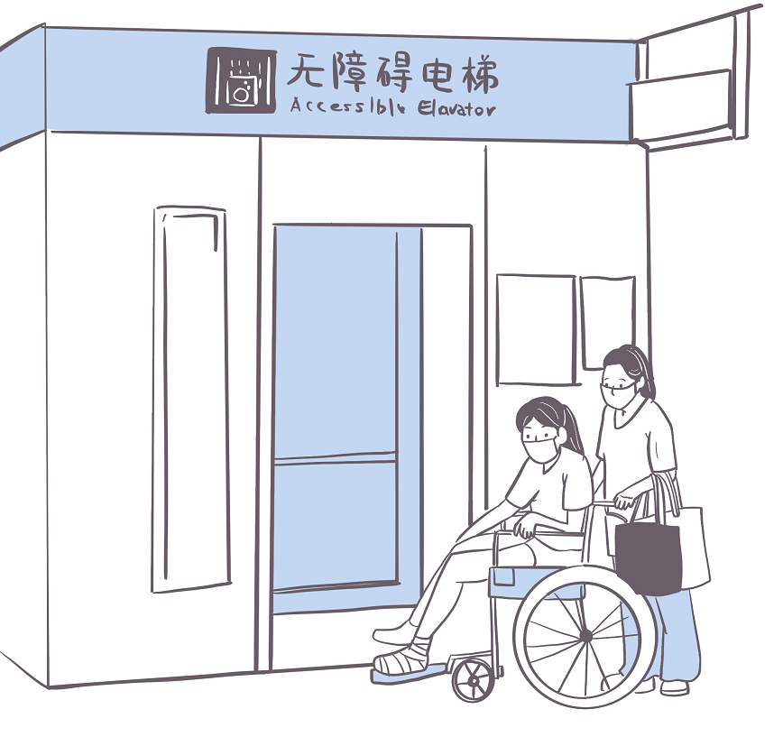 那天下午,她刚好要出门找朋友,便来到了家门口的地铁5号线大运河站,根据指示牌提示,她很轻松地绕过轮椅专用斜坡,找到了旁边的专用垂直电梯。