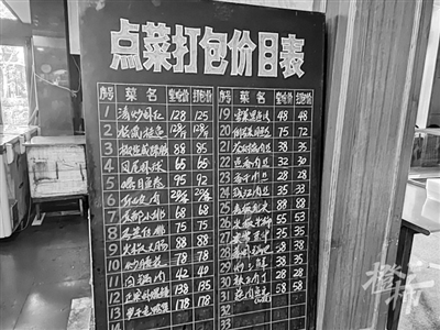 红色椅套,白色桌布,每个包厢都有个好听名字。进门右手,一个大大的冰柜,贴满了各类菜肴图片,上面写着:“现点现烧,打包带回。”左手一块大黑板,菜名和价格整齐呈列,非常详细地写明了堂食价和打包价。