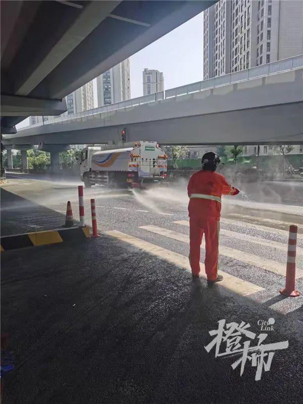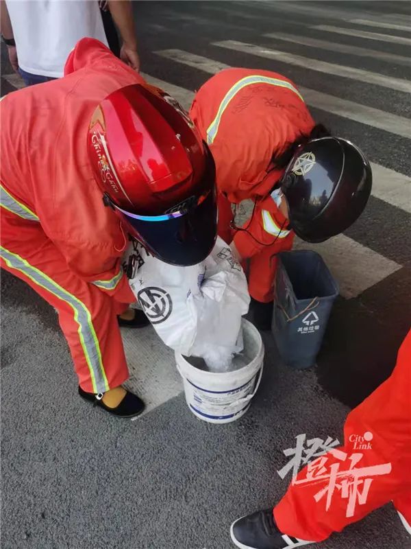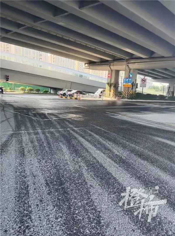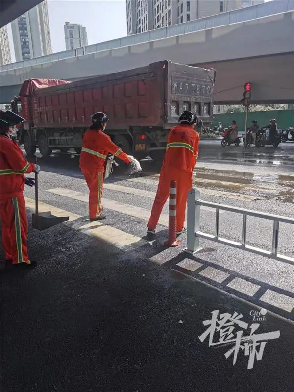 马路上一大片油渍,现场的环卫工正在想办法。李大姐早上8:40到的,她说:“我们已经用洗衣粉、洗衣液来回冲洗了3次,洒水车已经用了3个车次的水,还是没用,你看现在还要打滑。我们正调用老碱过来,那个是专门对付重油。”