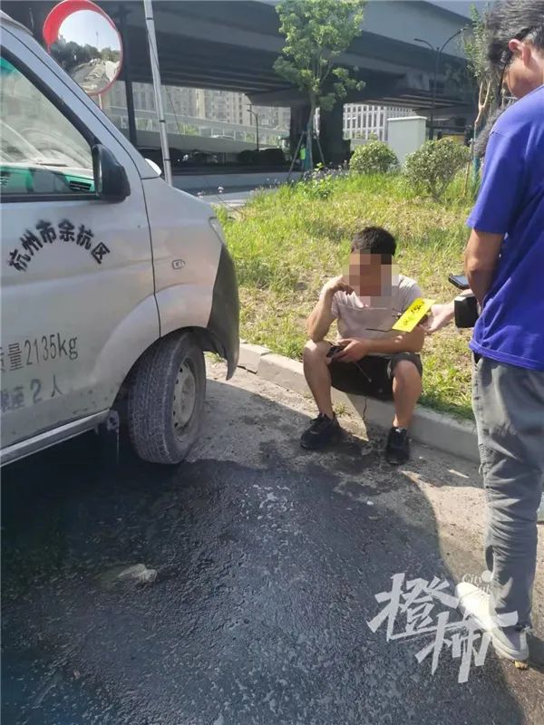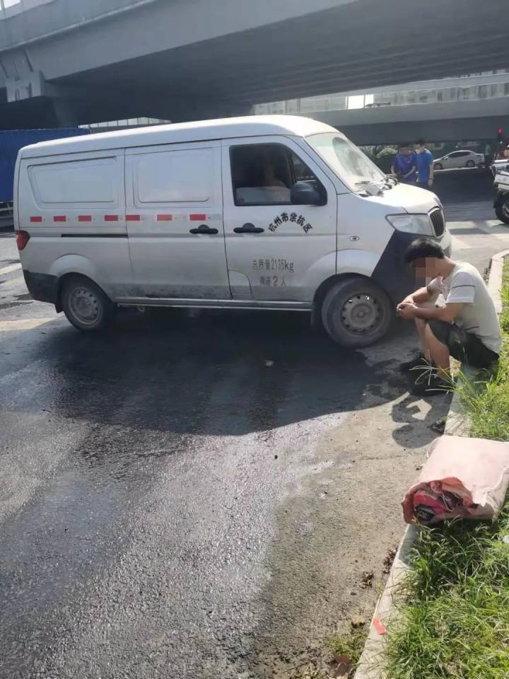 只见车和司机正在路边上,边上是原近江美食城,目前是个大工地。司机30多岁,一言不发地坐在马路牙子上在翻看着手机,问他也是什么都不知道。边上的面包车还在滴着柴油,流了一地,车身上喷着杭州市余杭区,车厢封了起来,看不到内部情况。