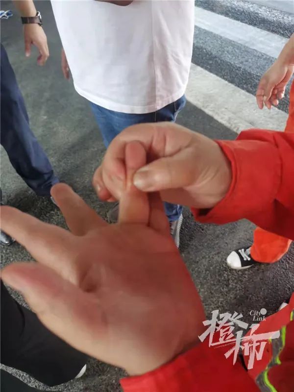 环卫工孙师傅不小心手上碰到了老碱,留了个红印子。
