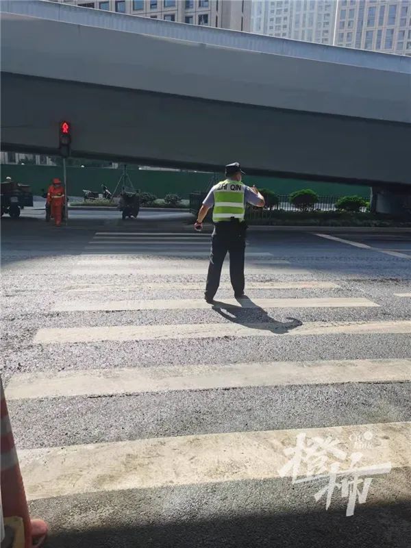 全是柴油的地段位于秋涛路与近江路交叉口,红绿灯口及转弯处都是油渍。人走在上面打滑,车子踩刹车会往前滑。现场交警正指挥着车辆慢行通过。年纪大的路人交警都扶着过去。