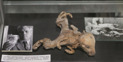 看了说明才知道,它是母猪受到高放射性物质污染后产下的一只畸形猪仔,出生于1986年5月。