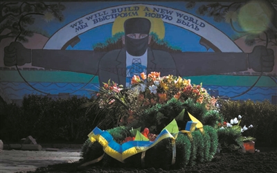 纪念园中用英语标注了这样一句口号:“我们将从过去的灰烬中建造新的世界!”