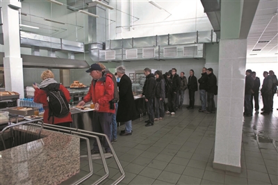 在进入食堂前,每个人都要经过一道辐射强度安全检查门,这里有一台差不多一个人侧身宽的电子仪器,双手举起放在机器两侧,样子像是在医院里做胸透。只要辐射不超标,机器就会显示“Чистота”(俄文“干净”的意思),这样我们就被允许进场吃午餐了。