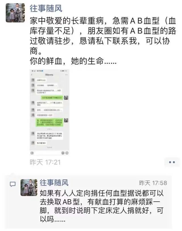 “家中敬爱的长辈重病,急需AB血型,如有AB血型的路过敬请驻步,恳请私下联系我。你的鲜血,她的生命……”