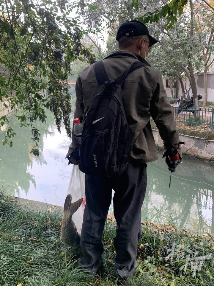 两位大伯在河边钓鱼。其中一位手里拿着伸缩网兜,他也已经兜上来一条五六斤的鲤鱼。大伯说自己是附近的居民,早上来河边遛狗,看到有大鱼就向钓鱼的朋友借了个网兜,没想到真的有收获,“这条河一般都是夏天有鱼会因为换气浮上来,今天不知道是怎么回事。”大伯也有些纳闷。