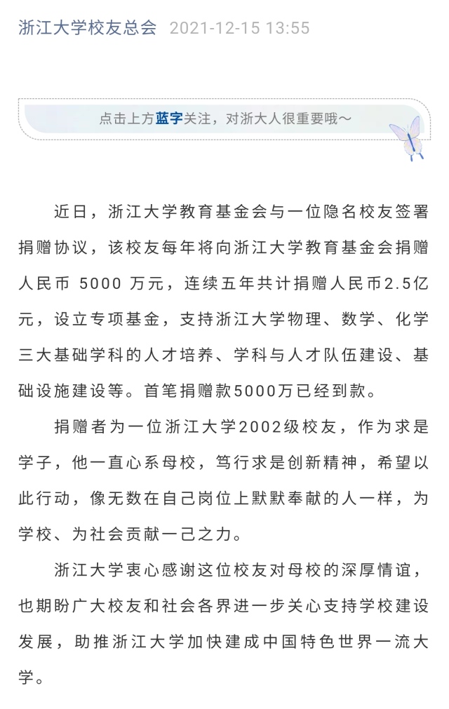昨日,“浙江大学校友总会”微信公号发布消息,浙江大学教育基金会近日与一位隐名校友签署捐赠协议,该校友每年将向浙江大学教育基金会捐赠人民币5000万元,连续五年共计捐赠人民币2.5亿元,设立专项基金,支持浙江大学物理、数学、化学三大基础学科的人才培养、学科与人才队伍建设、基础设施建设等。首笔捐赠款5000万已经到款。