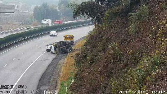 12月14日14时01分,G56杭瑞高速上发生一起小车追尾拖车的交通事故。事发时,拖车侧翻,车上一辆白色小车也随即侧翻。浙江交通集团杭州北管理中心视频巡查员目睹了事故发生的全过程,随即通知相关施救力量并报告了情指中心的民警。