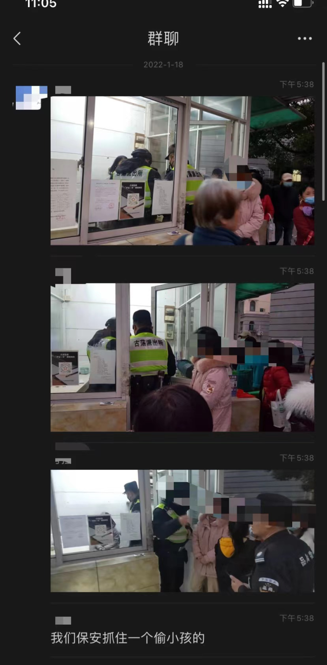 聊天记录大致的内容是,“18日下午五点半左右,嘉绿苑小区发生诱骗恐吓5岁儿童事件。热心业主和保安发现小姑娘大声哭然,抓住嫌疑人,并移交派出所……”聊天记录还配上了多段视频和照片,甚至还有一位“当事人家长”出面回应,是“自己的孩子”。
