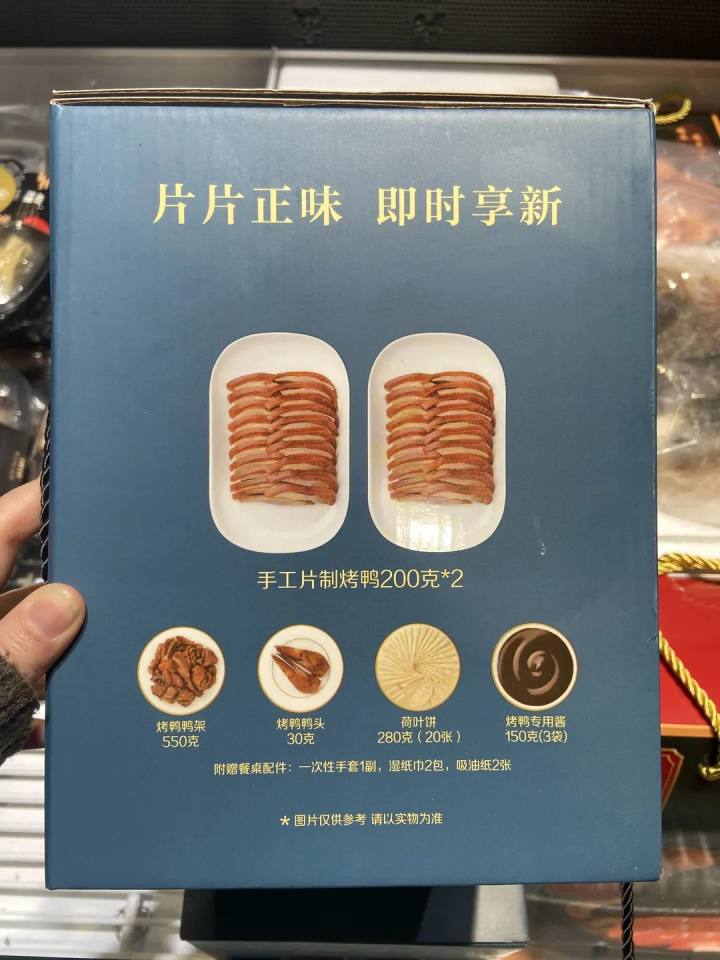 另外,全聚德烤鸭也来凑热闹了。一盒包括2包200g片好的烤鸭,鸭架和鸭头也没少,另外荷叶饼和烤鸭酱也有,还有一次性手套、吸油纸等等。本来有点疑惑:会不会加热了软塌塌不好吃啊?仔细看了下上面的说明,建议是进烤箱或是空气炸锅简单加工。那应该还能保持鸭皮脆脆的口感。这一盒也特价,299元原价,现在198元。