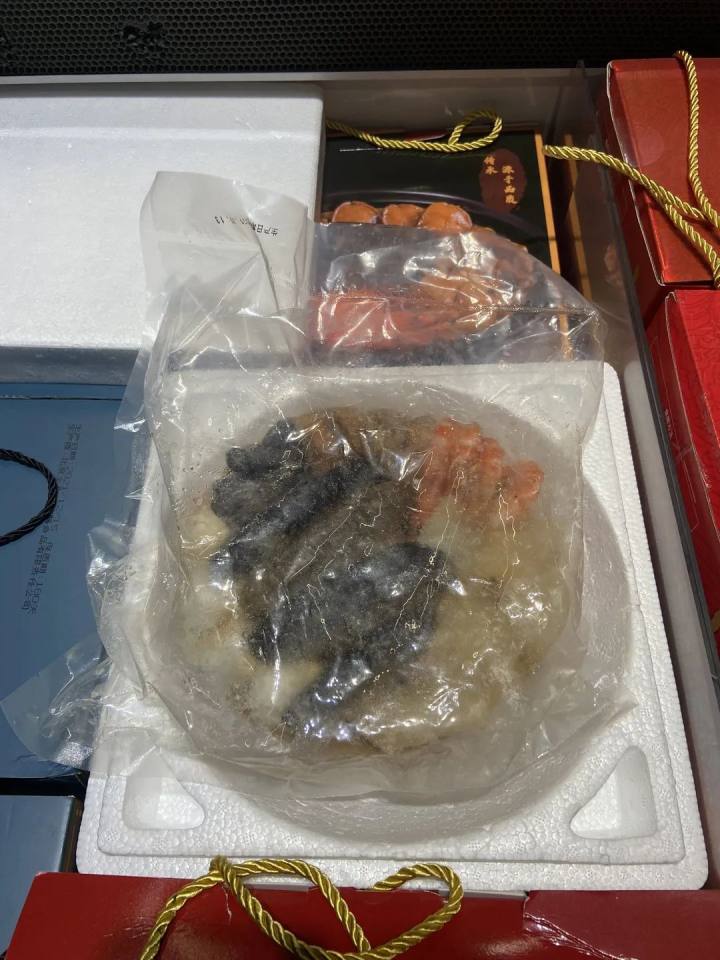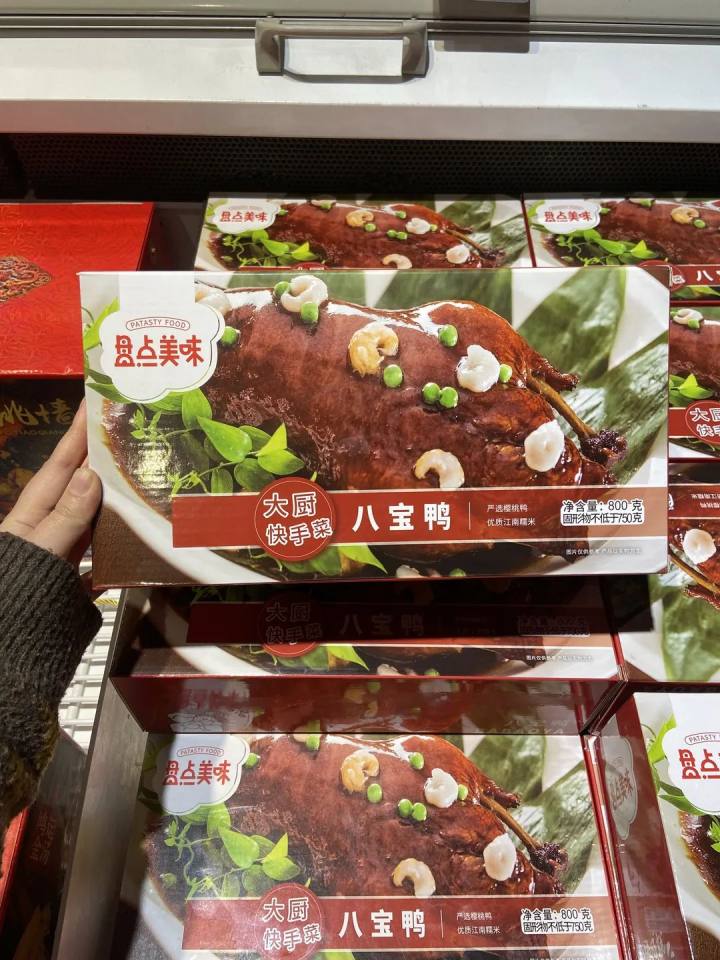 我在研究这俩联名款的时候,边上超市自营海鲜岛的大姐,特地把我拉了个转身,“看看这个,我们也有年夜饭的!”