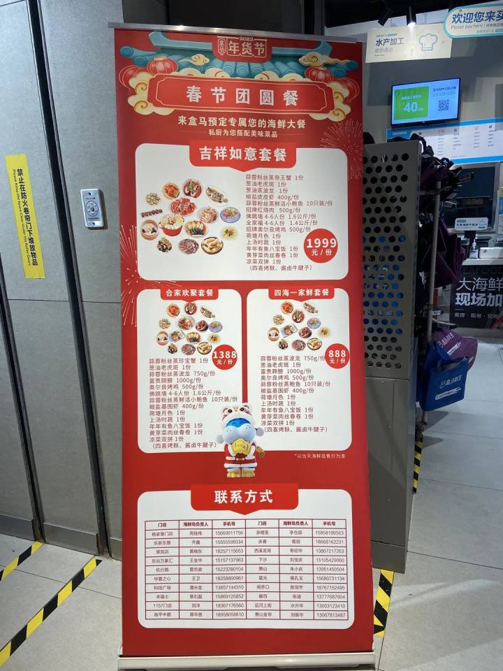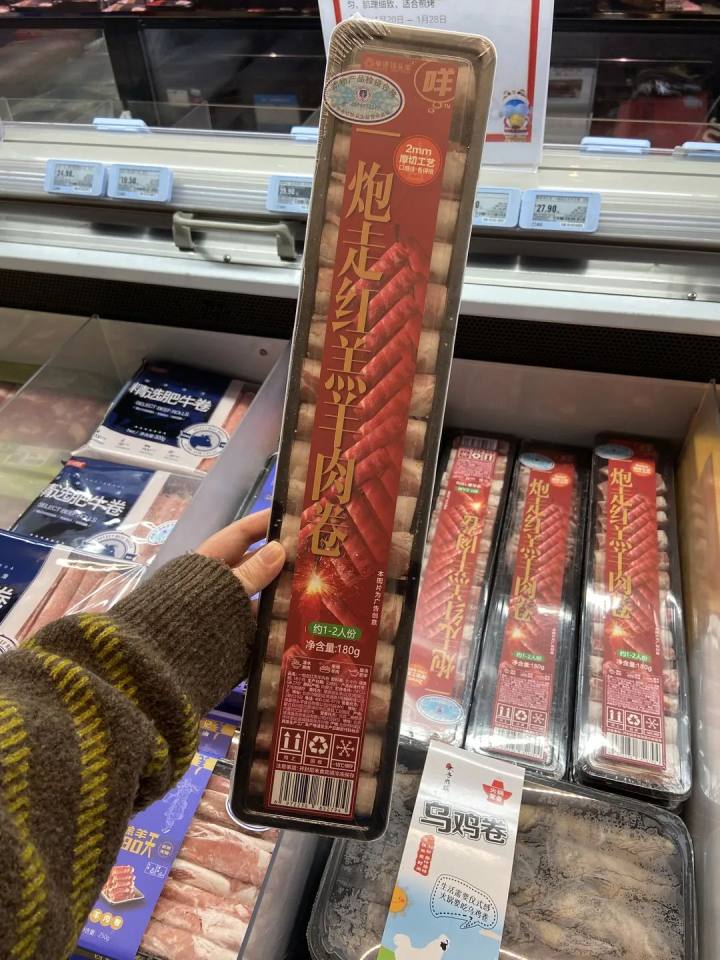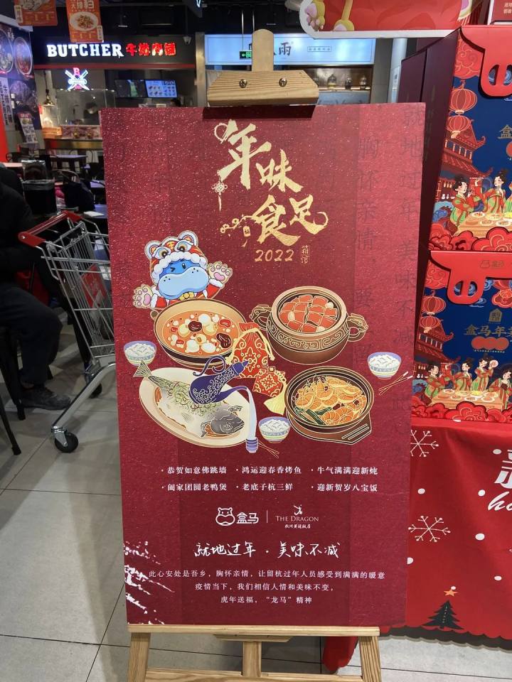 最近几天的盒马,线上热闹,线下也是人人人。超市里随处可见“虎年大集”的招牌,你看你看,懂仪式感的盒马啊,把羊肉卷都做成鞭炮的样子!这是为了弥补杭州人过年,在主城区里不能放烟花的遗憾嘛?