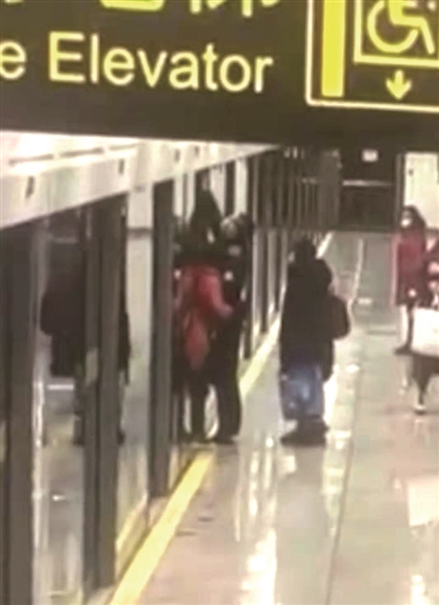 站台工作人员按动车厢上方装置,帮助被夹乘客。