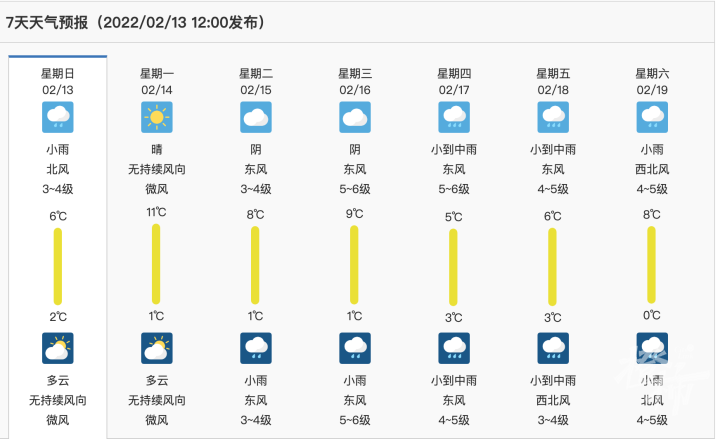气温则会随晴雨转换有所起伏。14-16日早晚气温较低,昼夜温差较大,最低气温平原地区0~3℃,山区0~-3℃有冰冻,最高气温9~12℃;其余时间最低气温3~5℃,最高气温6~8℃。