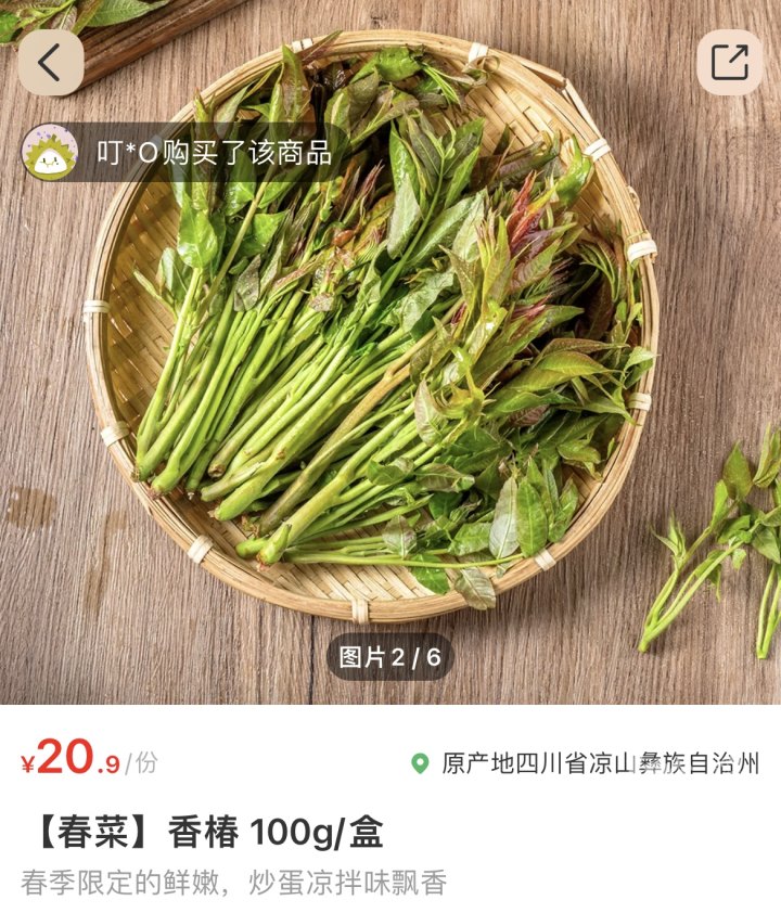 但这些香椿都不是本地产的,盒马的香椿产地是云南红河,叮咚买菜的香椿产地是四川凉山彝族自治州。