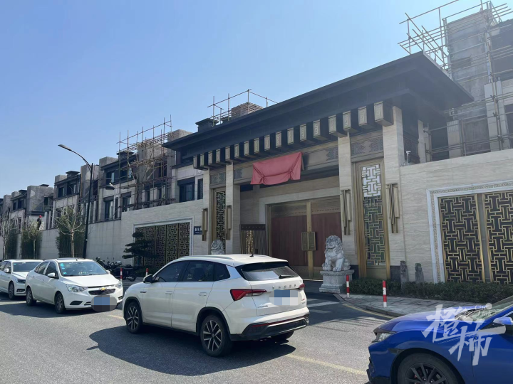 现场的情况,证实了业主的说法。我们看到,目前,文茂街上的杭州院子大门已经关闭,门头上金色的大字“杭州院子”用红布头盖着。大门正对面,俨然一副停车场的样子,停了不少私家车。在这条街上,目前泰禾杭州院子仅保留一个车辆进出口,由保安值守。