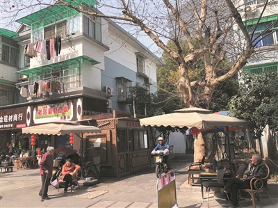 钟表旁,三四张竹藤椅,胭脂新村的老人们,习惯在这里喝茶、聊天,阳光照在身上,或许是他们最开心的时刻。