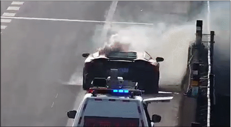 15时54分辅警金立驾驶警车到达起火车辆的后方。这是辆红色兰博基尼跑车,此时已是浓烟滚滚,火苗在引擎盖上四处跳窜。驾驶员站在车后,看到警车到来便迅速向警车跑去,并告知金立车辆在冒烟着火的状况。