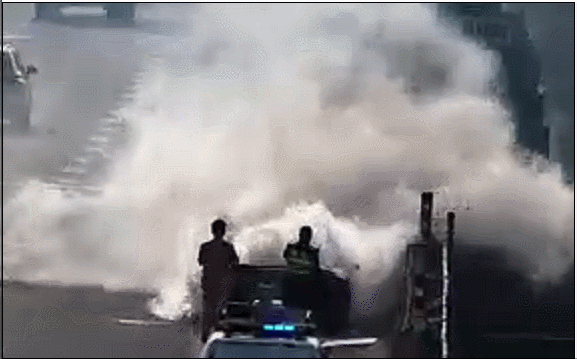 金立一个箭步跳下车拿上随车携带的灭火器向冒烟车辆狂奔而去,随即对着浓烟处喷射灭火。不到十秒时间,车辆突然火势增大,并传出巨大的爆鸣声。