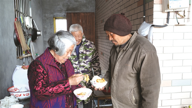 中午11点,瓜沥镇解放村宣丙水的家里飘出了饭香,老伴儿李彩英将饭菜装好。不一会儿,宣世才就熟门熟路地进来拿他的午餐。