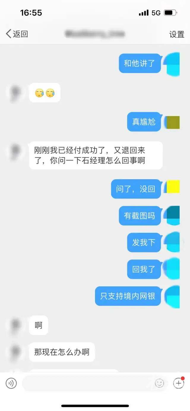 东东说自己转过去,过了一会儿说转账失败了,被退回来了,截图上称外汇饱和,接收票款的方式仅支持境内网银。”现在怎么办啊?“,东东还提出让王先生先帮转,等自己回来就还给他。