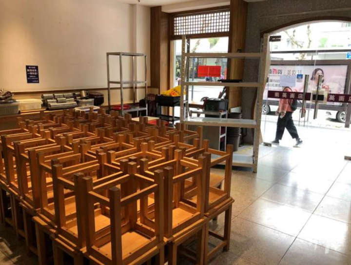 店里桌椅已经挪在一起,员工说下午有车子过来,拉到其他分店。