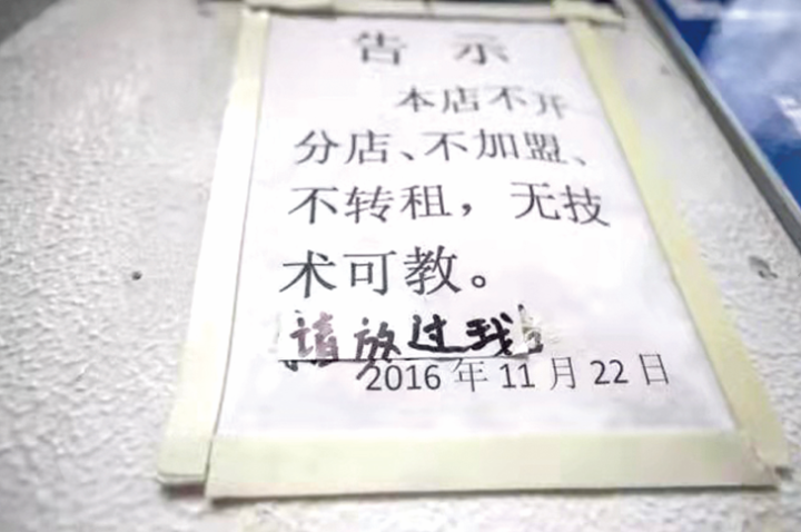 出名后,找来投资的、合股的、加盟的、学艺的……络绎不绝。老颜不胜其扰,在店门前显眼位置挂出“不开分店、不加盟、不转租,无技术可教”的告示,底下还加了一句“请放过我”。