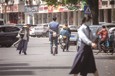 潮鸣寺巷,脚踩独轮平衡车的上班族,手上拿着打包的麦当劳纸袋。