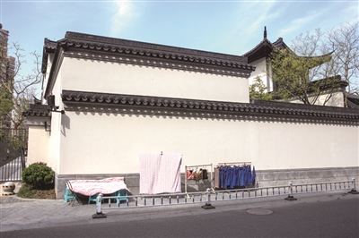 珠碧二弄,附近商户在凤起潮鸣围墙外晒被子。