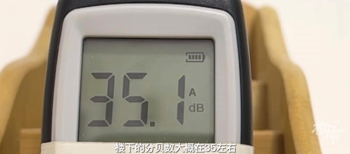 在二楼没有人员走动的情况下,实验员测得楼下房间的环境音量为35.1分贝;然后,实验员在楼上房间跳起了刘畊宏的《本草纲目》……