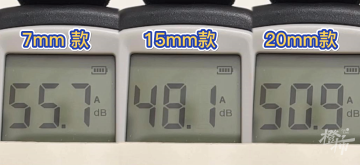 7毫米款55.7分贝、15毫米款48.1分贝、20毫米款50.9分贝。