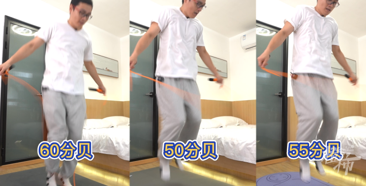 另外,家中有娃的橙友们都懂有种每日打卡叫跳绳;经测试,直接在地板上跳绳,楼下能听到的噪音大概在65分贝左右,使用三款垫子后,噪音分别是60分贝、50分贝和55分贝,比跳操噪音要高,所以跳绳最好还是去户外。