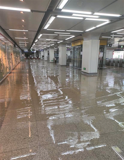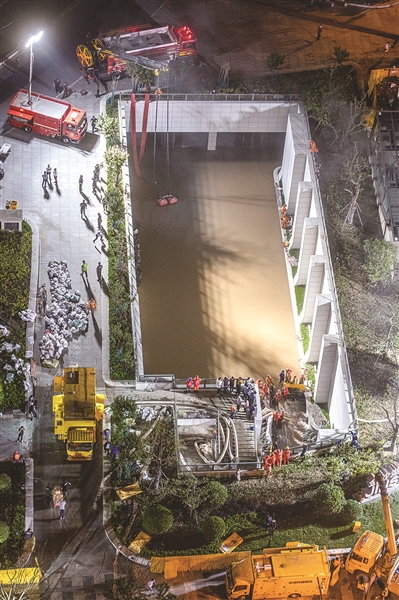 21:00,金沙湖地铁C口广场,地面还在不断抽水排往湖中,沿着广场台阶进入地下一层,水位已经漫过台阶,用一根钢管试了试水深,约80厘米。