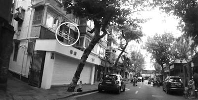 都市快报报道 一位老人站在一楼商铺顶上,人卡在阳台外墙和晾衣杆间,来来回回移动。