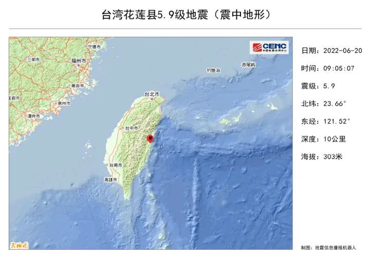 都市快报报道 中国地震台网正式测定:06月20日09时05分在台湾花莲县(北纬23.66度,东经121.52度)发生5.9级地震,震源深度10千米。