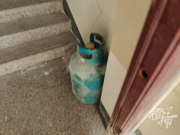 记者查看现场后发现,失火厨房中并未发现明显用电插头,一瓶煤气罐放在厨房外围的楼梯口,但是煤气罐瓶身并无破裂痕迹。