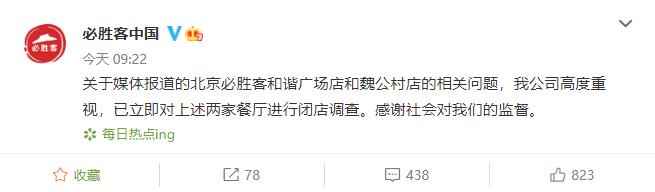 关于媒体报道的北京必胜客和谐广场店和魏公村店的相关问题,我公司高度重视,已立即对上述两家餐厅进行闭店调查。感谢社会对我们的监督。