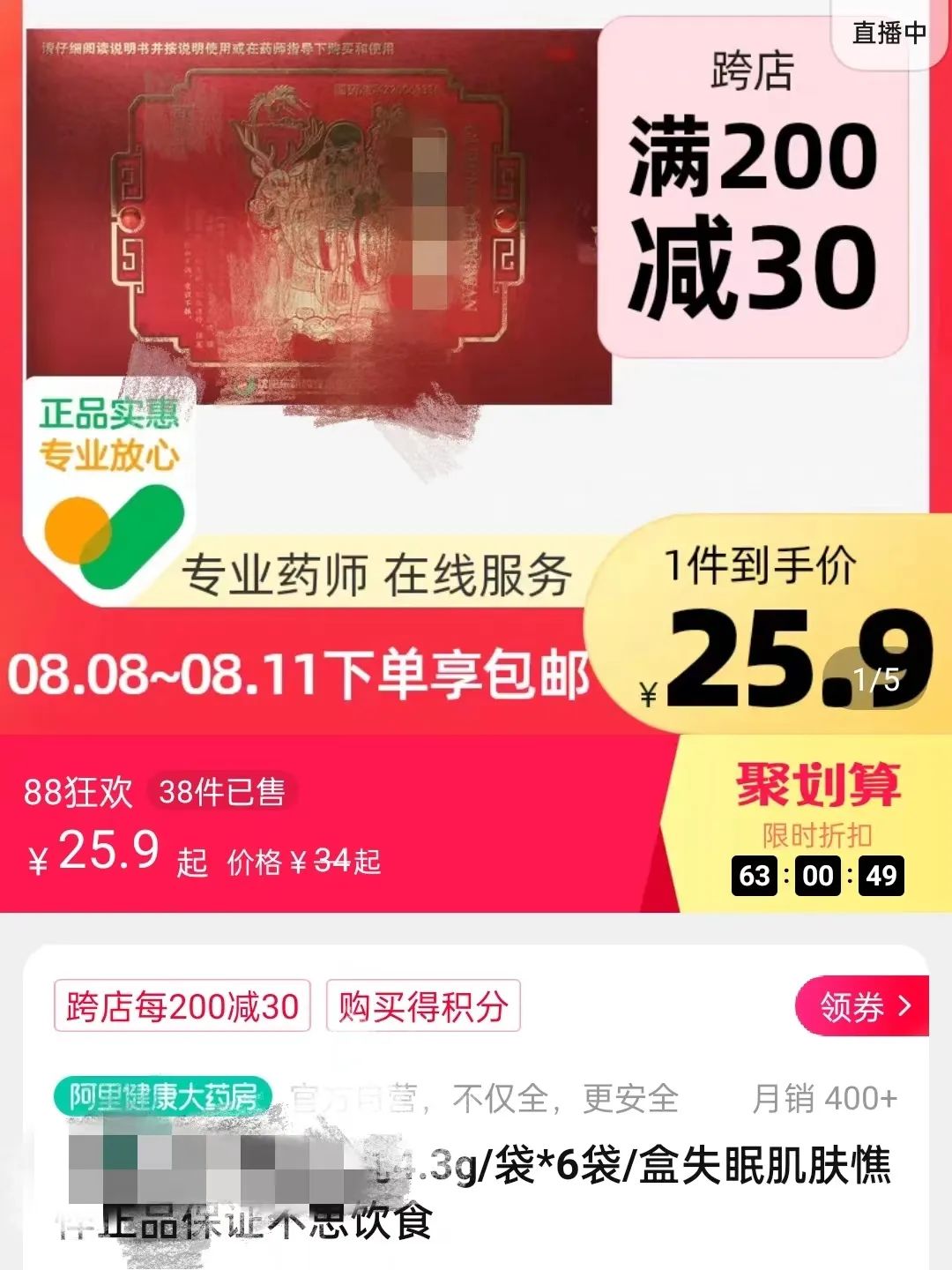 “xx胶囊”的外包装上,其主治功能写着调节全身代谢,恢复细胞活力,改善心血管功能等字样。柜台工作人员说,此产品一盒的价格也是999元,里面有5盒可以吃30天,也是三盒为一个疗程。