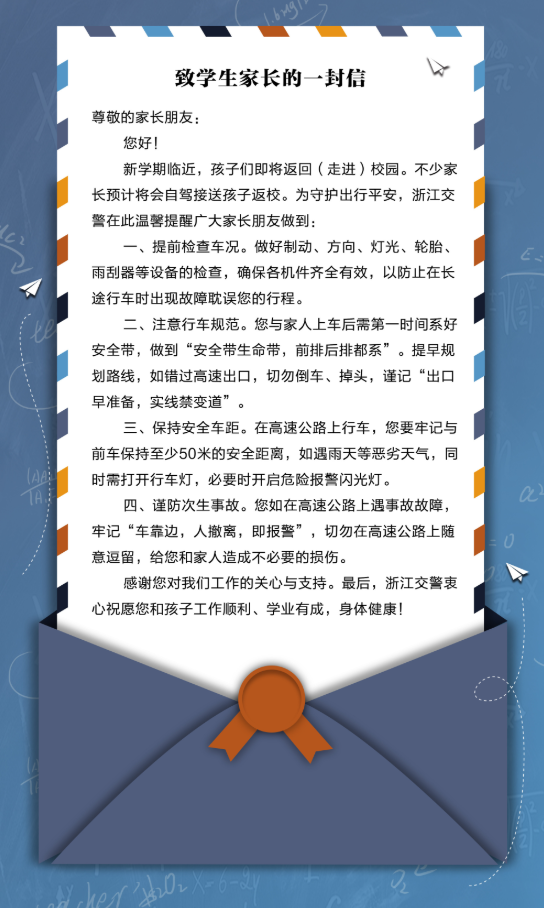 随着开学季到来,为切实提升中小学在校师生交通安全意识和自我防护能力,浙江省公安厅交通管理局以秋季开学为契机,向全省广大学生家长发出以“平安返校”为主题的倡议信,倡导广大自驾出行的家长遵守交通法规做到文明出行,也为2022年秋季开学创造良好的道路交通环境。