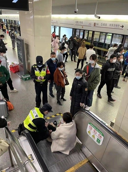 打铁关站巡逻队员和辅警发现,边打120边救护,张女士说自己腰痛死了,大家让她别动,一边安抚她。看到张女士这样,徐女士一家也慌了神,感到很抱歉。