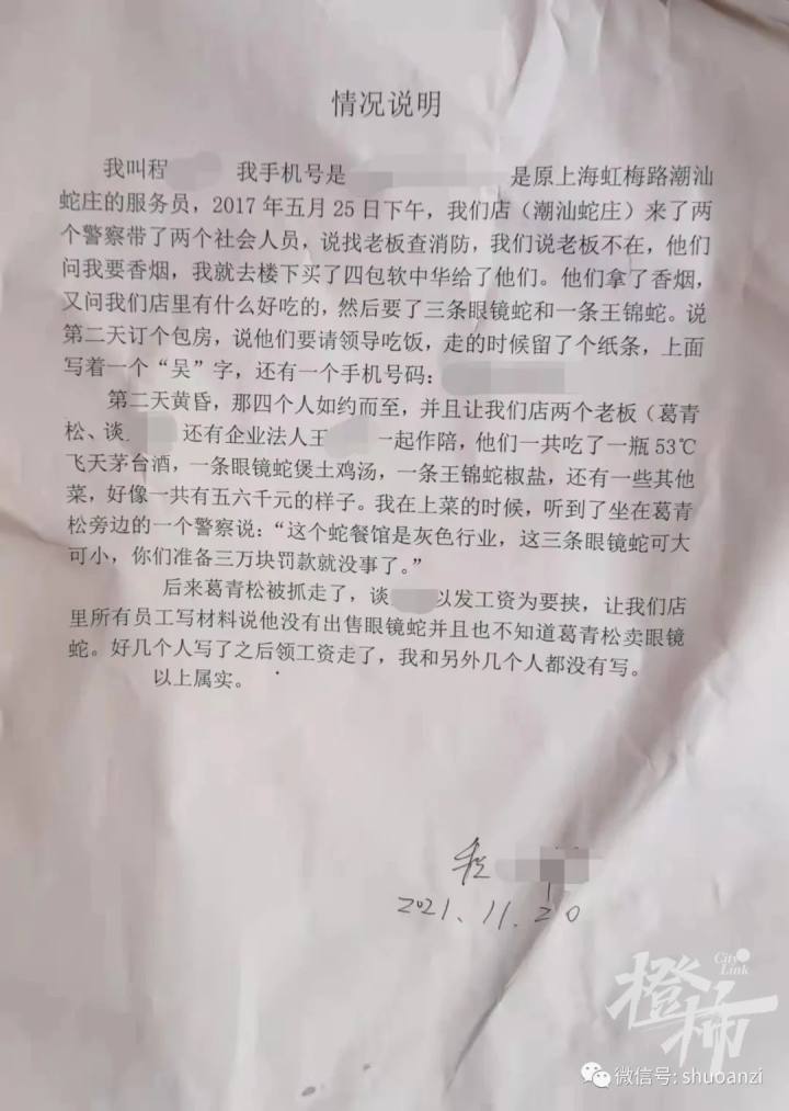 程姓店员提供的情况说明中说,当年5月25日当天下午,有自称是杨浦区长白新村派出所两个民警前来,带了两个人,说找老板消防检查,我们说老板没在,他们问我们要香烟,我就去楼下卖了斯堡软中华给了他们,他们拿了襄阳,问我们店里有什么好吃的 ,要了三条眼镜蛇和一条王锦蛇带走了。还说第二天订个包房,要请领导吃饭,走的时候留了个纸条,上面写了手机号码,还写了吴。