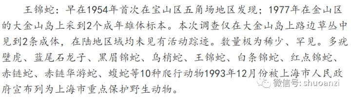 在2004年发布的“上海野生动植物资源概况”中,提及:1993年12月份,王锦蛇等10种爬行动物被列为上海市重点保护野生动物。