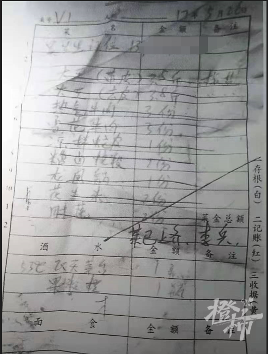 两个“大王”(注:即大王蛇),分别注明:带皮和去皮,以及各自重3.5斤和3.8斤,另外还有:牛肉、拌蛇皮、卤蛇段、龙凤锅(为眼镜蛇炖土鸡煲)、花生米、时蔬,还有一瓶飞天茅台和果粒橙。上面的时间是17年5月26日,桌号:V1。