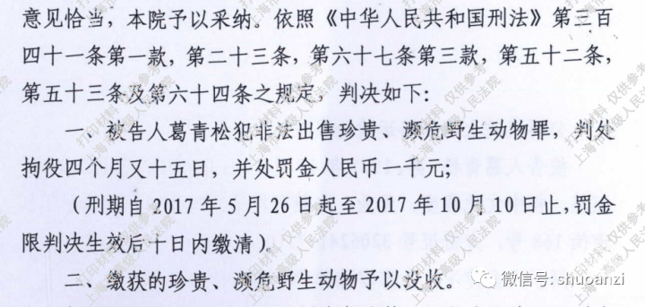 从裁定书上还可以看到,原告葛青松在2017年5月25日被抓后,此后,其因涉非法出售珍贵、濒危野生动物罪,被判处拘役4个月15天,并处罚金1000元。