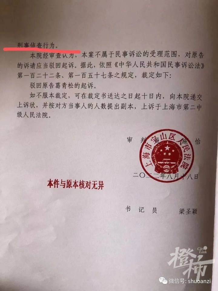 今年7月,杨浦区法院审理认为本案不属于民事诉讼的审理范围,驳回了原告起诉。